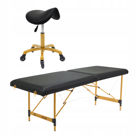 - Łóżko kosmetyczne Space Gold z regulacją wysokości, złotym stelażem i miejscem na nogi. W zestawie ergonomiczny taboret Rodeo czarno-złoty. Idealne do stylizacji rzęs, makijażu permanentnego i zabiegów beauty.